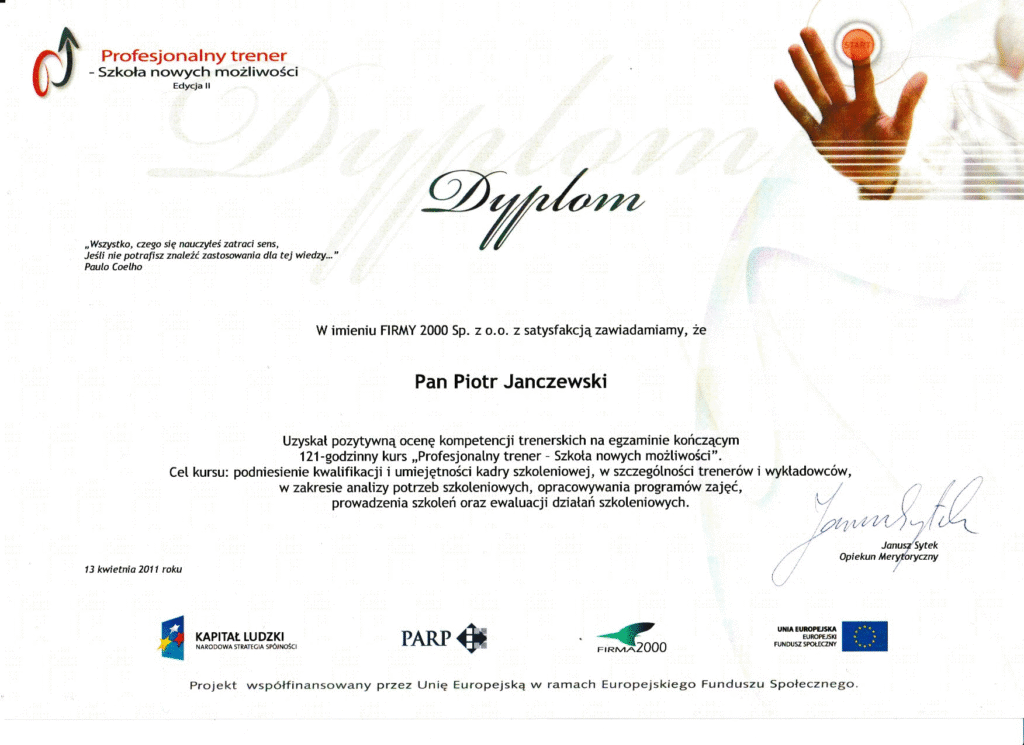 Jestem certyfikowanym trenerem biznesowym (Firma 2000).